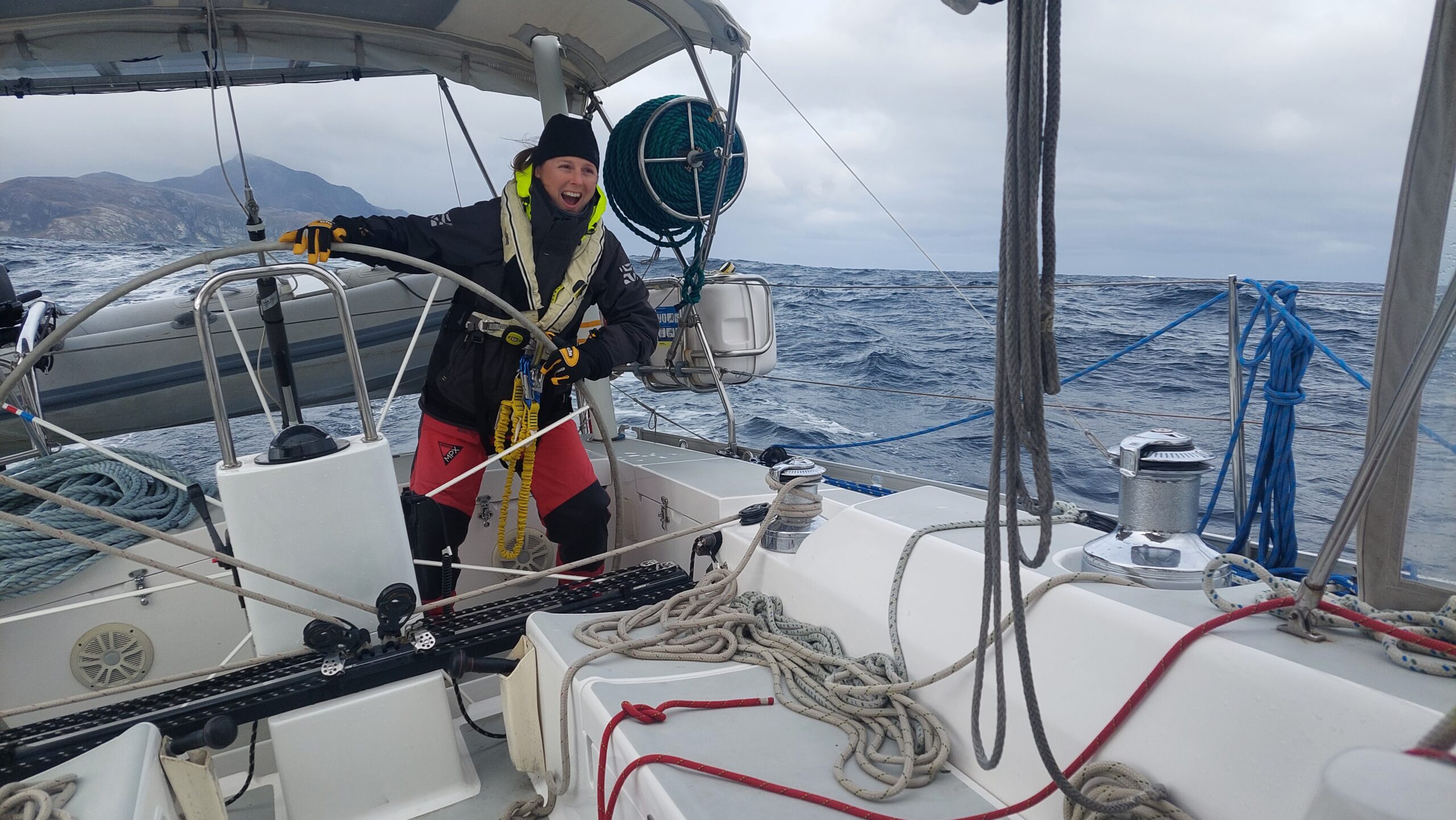 The weather was poor, cloudy, rainy, and there were large swells. What we had hoped would be warm water spinnaker sailing for days on end in a deep blue ocean was not the case! Beam seas of gray and white crashed the deck as we reached at speed under reefed sails away from the mainland. Occasionally, we would have respite, the sun would come out, and we could set the gennaker again. Easy sailing was always short-lived, as the kite was doused again, and the stormy weather pushing up from the south returned.